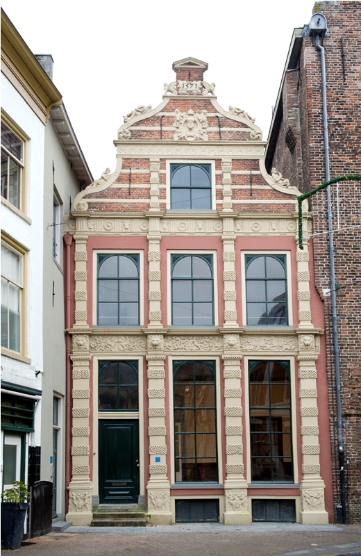 Representatieve, statige, ingang in het Karel V-huis aan de Sassenstraat.