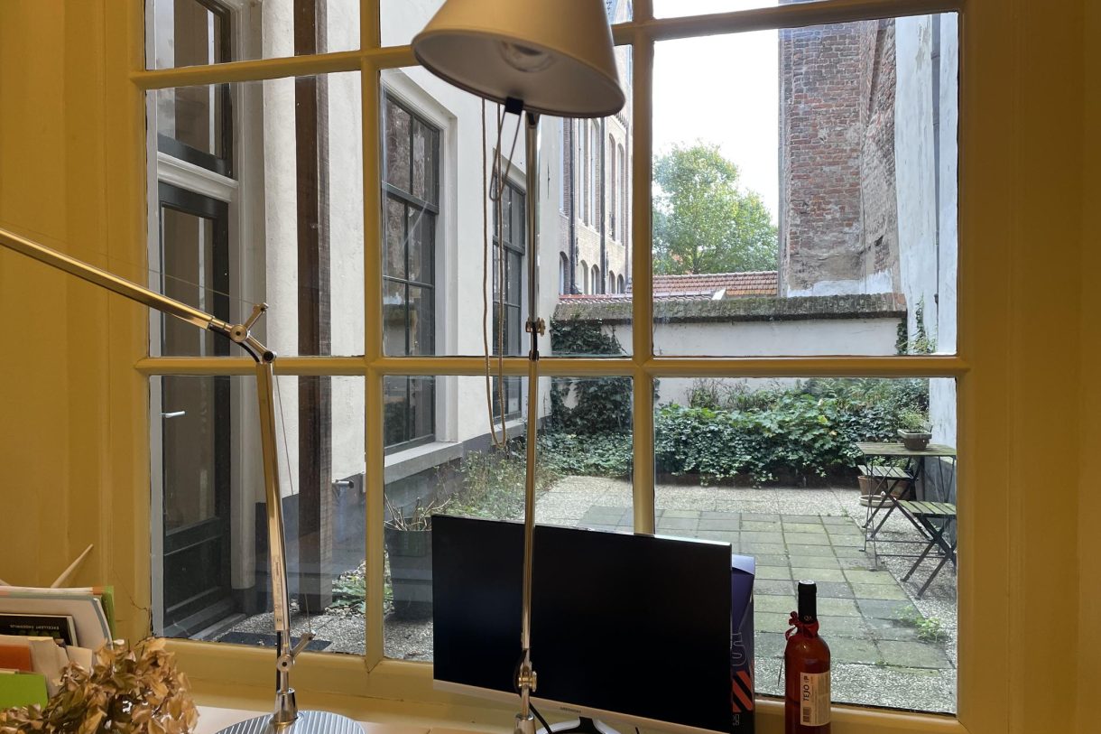 De ruimte grenst aan een ruime (gemeenschappelijke) binnenplaats die via de grote raampartij een open gevoel aan de kantoorruimte verstrekt.