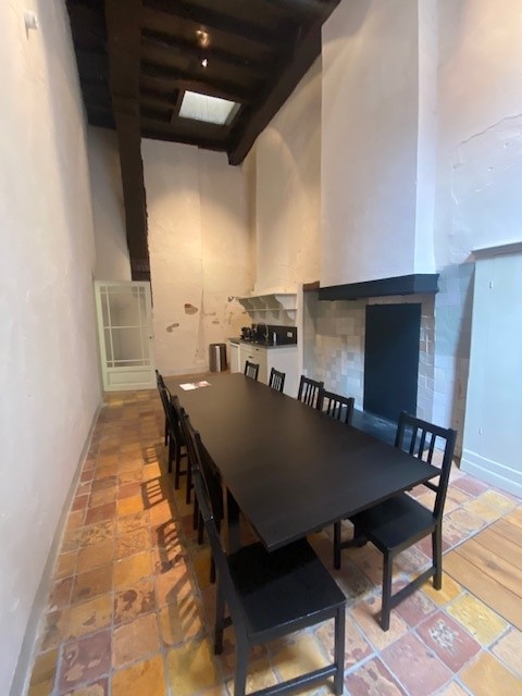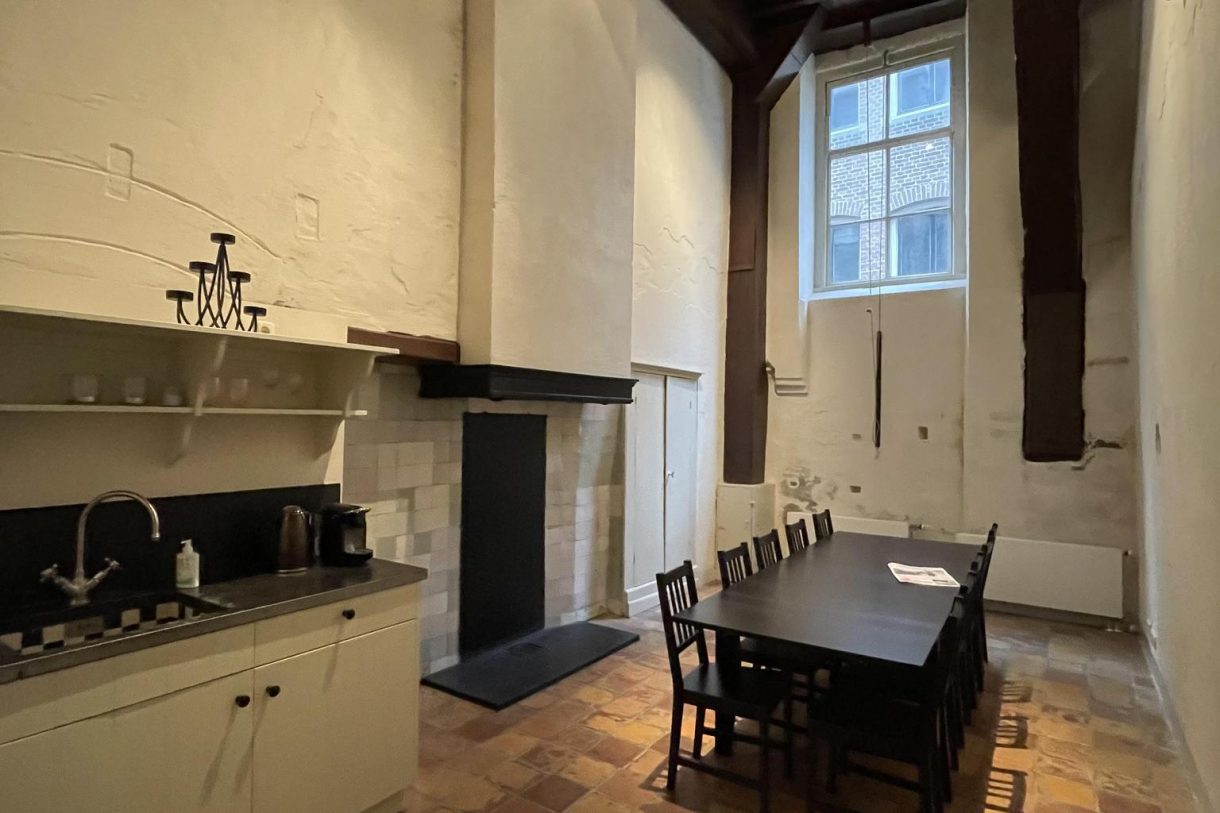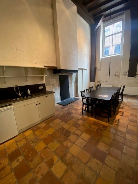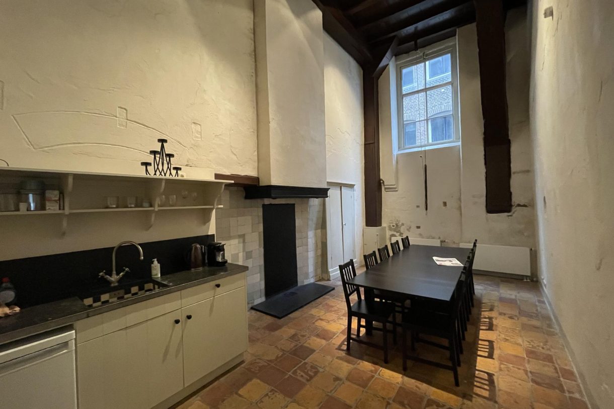 Via de hal bereikt u achtereenvolgens de gemeenschappelijke toiletgroep en een prachtige, zeer ruime, historische keuken (eveneens voor gemeenschappelijk gebruik).