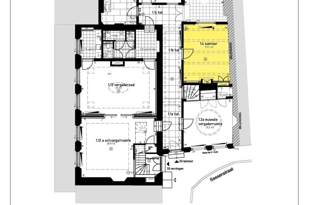 De kantoorruimte maakt deel uit van een historisch complex met drie kantoorruimten op de begane grond en drie appartementen op de verdiepingen.