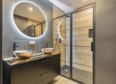 De moderne badkamer met inloopdouche en wastafelmeubel met twee waskommen bevindt zich naast de slaapkamers.