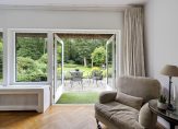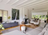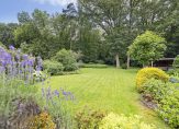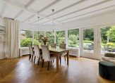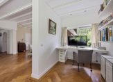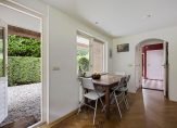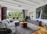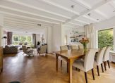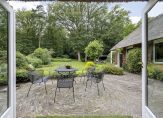 De sfeervolle living met visgraatparketvloer en een schouw met open vuur is aan de achterzijde in stijl uitgebouwd met een eetkamer en een praktische studiehoek; vanuit de kamer is er middels openslaande deuren toegang tot de prachtige tuin met groot terras, gazon en bos.