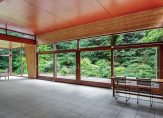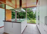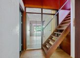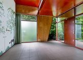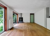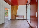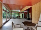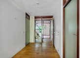 De hal geeft toegang tot de loftachtige woonvleugel met een groot terras op het zuiden en een vleugel met studeerkamer, kleedkamer, badkamer en slaapkamer met toegang tot een loggia en uitzicht op de parkachtige tuin.