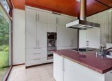 Vanuit de keuken en het aanpalende terras heeft u een geweldig uitzicht over de – eveneens onder architectuur aangelegde – tuin met gazon, borders en een gevarieerde houtopstand met prachtige borders met rododendrons.