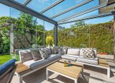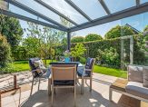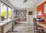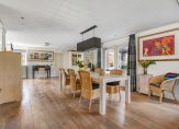 centraal bevindt zich de eettafel met toegang tot een intieme tuinkamer/serre (15 m2), voorzien van een infrarood terrasheater en in de andere vleugel een deels open bibliotheek.