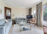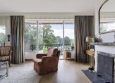 De sfeervolle woonkamer met originele schouw en open haard heeft openslaande deuren naar balkon op het zuiden