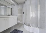 Aan de voorzijde van het appartement bevindt zich een royale slaapkamer ( voorheen twee kamers) met eigen ruime badkamer voorzien van douche, toilet, en wastafelmeubel.