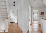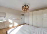1e verdieping: Overloop met vaste trap naar de tweede verdieping. De overloop geeft toegang tot de 3 slaapkamers. De slaapkamers zijn allemaal voorzien van eikenhouten parketvloeren. De slaapkamer aan de achterzijde van de woning heeft een wastafel, de kleinste slaapkamer heeft toegang tot het balkon aan de achterzijde.