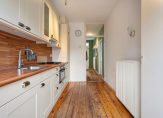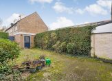 in het verlengde van der gang bevindt zich de keuken; in de achtergevel geeft een deur toegang tot de tuin met terras en schuur met achteringang.