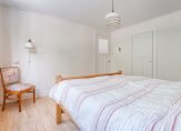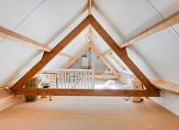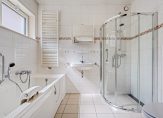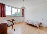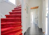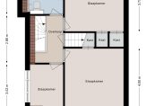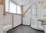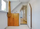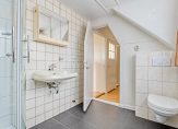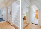 Overloop met trapopgang naar de zolderverdieping. Er zijn drie slaapkamers, waarvan twee slaapkamers vaste kasten hebben, en een tweede badkamer met douche, toilet en wastafel.
