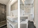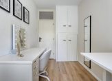 De badkamer is eveneens modern en voorzien van een douche en wastafel. Er zijn twee slaapkamers, waarvan één met toegang tot het tweede balkon, gelegen aan de voorzijde van het gebouw. Op de begane grond is er een berging aanwezig, deze is voorzien van elektra.