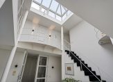 Het atrium is het kloppend hart van de woning met toegang tot de diverse vleugels van de woning met een uitgebouwde serre en toegang tot de tuin, een sfeervolle woonkeuken met lichte inrichting en alle denkbare apparatuur en een ruime bijkeukens met was- en droogmachine en ruimte voor een koeling, en proviand , alsmede een technische ruimte met een ketel voor de luchtverwarming, een warmtepomp en een combi c.v. ketel.