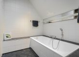 De open trap naar de vide en de omloop geeft toegang tot een master bedroom met eigen badkamer met een comfortabel ligbad, veilige en ruime douche, een nieuwe toilet en een wastafelmeubel met wastafels en een balkon.